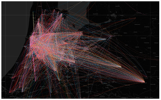 Example of an activity-based spatial material flow analysis (AS-MFA) result, concerning construction and demolition waster (CDW) originating in the Amsterdam metropolitan area (AMA), in tons/year, from origin (disposal location) to destination (storage or treatment location). Each color represents a CDW category.