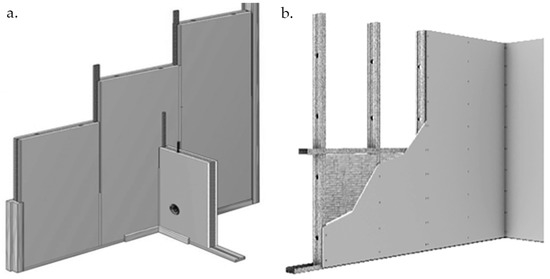 Regarding the materialization of hollow-wall partitioning, the main roles are claimed by the boards used for side-panelling and the insulation material within the cavity between two boards. A primary product with regard to side-panelling is gypsum board, which is widely used for partitions [50]. Gypsum boards are an example of materials that can function in circular models, consisting primarily of recyclable calcium sulfate dihydrate (CaSO4·2H2O). Although recycling rates are still relatively low on a European scale, the Netherlands shows increasingly high scores, induced by more stringent regulations that prevent transboundary landfilling [51]. Yet, an orchestrated effort is still required to fully capitalize on the recycling potential of gypsum-based waste. A recent study into the benefits of deconstruction (and segregated disposal) versus demolition (and disposal in mixed waste) showed that the latter is significantly more costly [50].