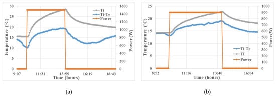 Variation of indoor and outdoor temperature while heating: (a) 4 hours heating at 1500 W; (b) 4 hours heating at 900 W; (c) 2 hours heating at 1500 W.