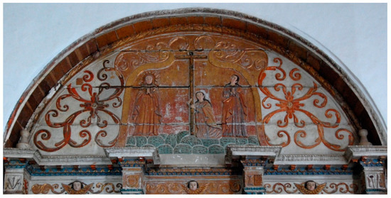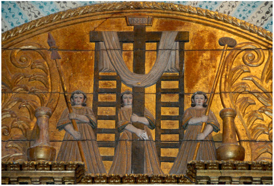 Again, caryatids standing upon bearded male heads, hold satchels of flowers. Their heads are topped by double capitals that support impost scenes. These scenes also represent the Arma Christi (from left to right): “The Nails, the Pincers, and the Hammer,” “The Crown of Thorns and the Box of Myrrh,” “The Seamless Tunic and the Thirty Pieces of Silver for Judas,” and “The Knife, the Sponge, the Lance, and the Lantern.” The upper pediment depicts the Cross surrounded by the Virgin Mary to the left, St. John the Evangelist to the right, and Mary Magdalene at the center, kneeling and embracing the Cross (Figure 11).