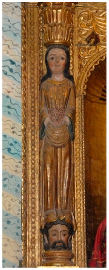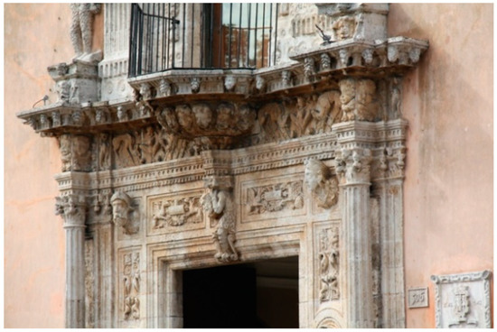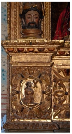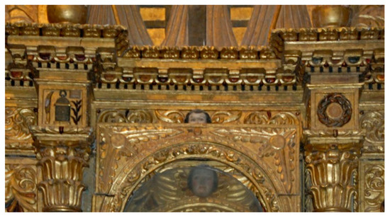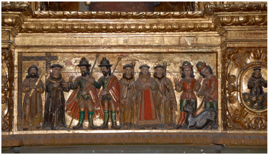 The predella, or lower zone of the retablo, depicts seven of them. Each scene occupies its own medallion, and they are separated from each other by a series of dense foliage that are typical of the Plateresque. In this idiom, such imagery is a reminder of the struggles of civility and Christianity to overcome sin and deceit that exists in a world without salvation. Such concepts are present throughout secular and religious works in Spain including the retablos in Pajares, Cádiz, Valencia, and Galicia and on façades like the Universidad de Salamanca’s or Hospital de Santa Cruz, Toledo or private residences like the Casa de Castril, Granada (Padrón Mérida 1993; Vila Jato 1987; Gómez-Ferrer and Corbalán de Celis 2012; Caramazana Malia and Bejarano 2020; Nieto Alcaide et al. 2009; Álvarez 2001; Barteet 2019). Whether secular or religious, dense foliage populated by grotesques, seraphim, wild men, and other fantastical creatures are often juxtaposed to larger and more discernable images of patrons, classical personas, and Christian iconography. The contrast between the sacred and profane with the grotesques and fantastical creatures is deliberate and conveys ideas about individual or communal self-representation, or as in the case of the retablos, they illuminate Christian theology, often centered on the Life of Christ and associated iconography to convey divine salvation through Christ’s acts, preaching, death, and resurrection.