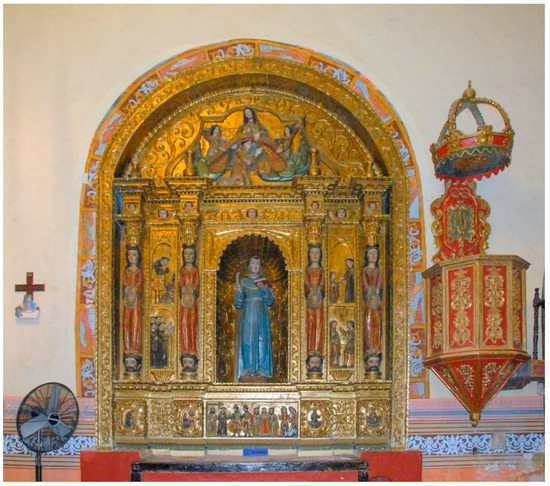 Pulpit and Retablo of San Antonio de Padua. Ex-convento of San Miguel de Arcángel, Mani, Yucatán, ca. eighteenth century. Photograph created by and used with Permission of Niccolò Brooker.