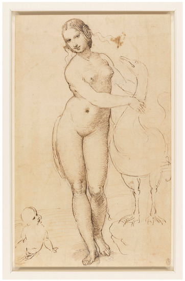 Raphael, Leda and the Swan, ca. 1507, pen and ink over black chalk underdrawing, 210 × 192 mm, RCIN 912759, Royal Collection, Windsor Castle. Royal Collection Trust/© Her Majesty Queen Elizabeth II 2021. Used with permission.