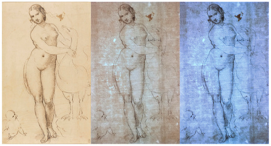 The drawing has been widely analysed from the historical–artistic perspective and is often described and compared, as a copy, to Leonardo da Vinci’s studies regarding the standing Leda. However, the vast bibliography on the subject does not satisfy the needs of those who wish to conduct an in-depth study of the aspects relating to the type of paper chosen by Raphael for his work. This important cognitive gap presents the opportunity to start a new study on the Windsor sheet to detect the codicological parameters necessary to provide new chronological and provenance indications on the document, auxiliary information compared to that provided by the history of art, paleography or examinations of the graphic ductus. These alternative markers of investigation define the impression left on the sheet by the mould of the metal frame originally employed during the papermaking process, especially in the watermark’s graphic appearance. Considering the artistic value of the artefact, the lack of any in-depth study of the paper medium is quite significant, especially in the light of the ever-increasing and efficient use of diagnostic techniques in the cultural heritage domain to interrogate materials for various purposes: study, archiving, monitoring, conservation, restoration and exhibition.