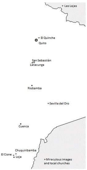 As argued by Tamar Herzog (2018), the establishment of reducciones in the early colonial period did not necessarily imply that Indigenous peoples had not been previously living in settlements but that they still had not been fully Hispanicized. Pastoral writings from the early colonial period, as well as stories about miraculous images, emphasize the remoteness, desolation and difficult terrain of Indigenous settlements. Thus, Fray Pedro de la Peña, who became bishop of Quito in 1565, noted that, seeking refuge from their enemies, the Natives had settled in harsh, mountainous and hidden places (“tierras muy ásperas, montuosas y escondidas”). Likewise, in 1598, Bishop Luis López de Solís stated that oftentimes they fled from the reducciones and lived absconded in ravines (guaicos y quebradas) (de Solís [1598] 1998, p. 460). Decades later, in his Itinerario para párrocos de indios, Alonso de la Peña y Montenegro (1668) stated that Natives lived in mountains, ravines and deserts (Herzog 2018). As argued by Herzog, insistence on such terms (montaña, guayco, quebrada) did not have to do with an actual place or habitat but referred to a conceptual space, on the margins of Christian civility and, therefore, potentially threatening to colonial society. Concerns about the need to incorporate the Indigenous hinterland into an ordered landscape clearly reverberates in stories woven around miraculous images.