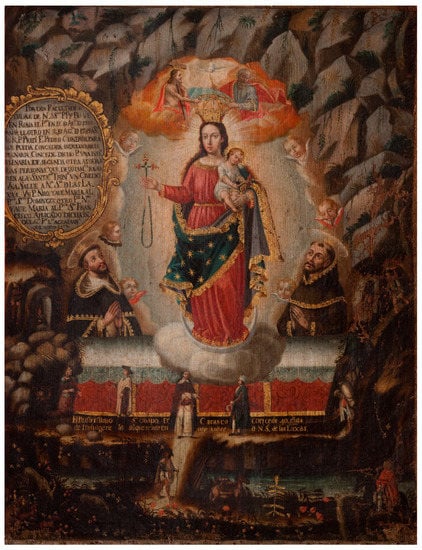 Montesinos ([1625] 1906, pp. 114–16) himself speaks about Our Lady of Sevilla del Oro, an early colonial devotion that flourished in the eastern Province of Quijos. In this remote town, on the rim of the jungle, the faithful had built a shrine in honor of the Immaculate Conception. Lacking an adequate image for the chapel, a devout man by the name of Juan de Gavilanes had found an old print, ripped and smoke-stained, which he placed on the altar. Once enshrined, the print of the Immaculate Conception started to glow with bright and vivid colors (“colores tan vivos y encendidos”). According to one of the witnesses, the more she looked at the image, the more beautiful it appeared to her sight, as if a veil had been lifted from over her eyes. Once López de Solís received news of this miracle, he decided to take the image to the town of Riobamba, placing it in the recently founded convent of the Immaculate Conception. According to Montesinos, both Gavilanes and the bishop were concerned with assuring proper veneration for the print. Notwithstanding, he also acknowledges the opposition to the bishop’s decision by residents of Sevilla del Oro.