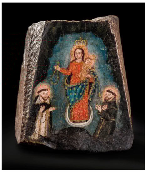 - Cummins, Tom. 1999. On the Colonial Formation of Comparison: The Virgin of Chiquinquirá, the Virgin of Guadalupe and cloth. Anales del Instituto de Investigaciones Estéticas 74–75: 65–71. [Google Scholar] [CrossRef][Green Version]