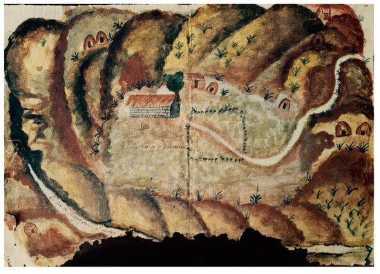 Speaking on behalf of the resettled members of the community, the protector de naturales, his witnesses emphasized, as did the map itself, the inadequate conditions of the original site, also called Pueblo Viejo. The picture depicts a humble edifice, built with poor materials and covered with a thatched roof. Lacking a grid plan, a few small huts were dispersed throughout the mountainous landscape. As if it were a deserted town, the site appears empty, not just of people but of any sign of social interaction or presence. Inscribed on the unoccupied space, captions identify the place, further emphasizing the sense of absence or emptiness. In his opening statement, the solicitor indicated—as does the watercolor—that by the end of the eighteenth century, San Sebastián merely retained the title of town, the only thing that distinguished it from the surrounding countryside (“solo se distingue de campo con título de pueblo”) (ANH/Q, Indígenas, Caja 145, Exp. 14, 1798, f. 2). No one was in charge of the village, he argued, except for a few dispersed Indigenous residents who lived distant from each other. He further noted that San Sebastián did not have a church but just an indecent chapel and a hut instead of a convent for the parish priest.