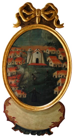The fire, Altagracia medallion, oil on panel, c. 1760–1778, Museo de Altagracia, Higüey. Used with permission from Museo de Altagracia.