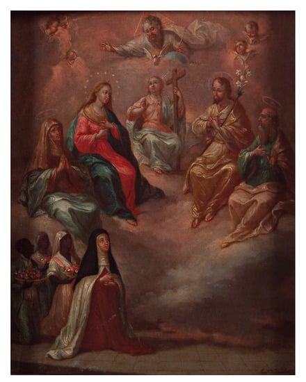 The acculturation potential of black bodies is a visual marker that can be found in the surviving religious paintings of enslaved peoples in the Spanish Caribbean: José Campeche y Jordán’s Exvoto de la Sagrada Familia (Exvoto of the Holy Family), 1778–80, in Puerto Rico, and José Nicolás de Escalera’s Familia del Conde de Casa Bayona (Family of the Count of Casa Bayona) (1770’s), in Cuba (Figure 7 and Figure 8). The black subjects in José Campeche’s Exvoto de la Sagrada Familia kneel behind a figure that commands authority and acts as a portal to hallowed space, just as the enslaved mute and Matías de Meneses in the Altagracia medallion (Figure 11). The kneeling Carmelite nun is pictured facing a vision of the Holy Family, closely followed by three possibly enslaved servants, decorously dressed, who carry her flower offerings.51 While the work was probably commissioned for private, devotional use given its portable size, the composition of blacks ushered into the Christian community speaks to a conventional mode of representation. The three figures bearing flowers gain integrity through the mediation of the nun, who introduces them to the holiest of companies. Their dignified representation, with gracious attire that de-emphasizes their laboring condition, visualizes the possibility of their transition into Christian civilization.52
