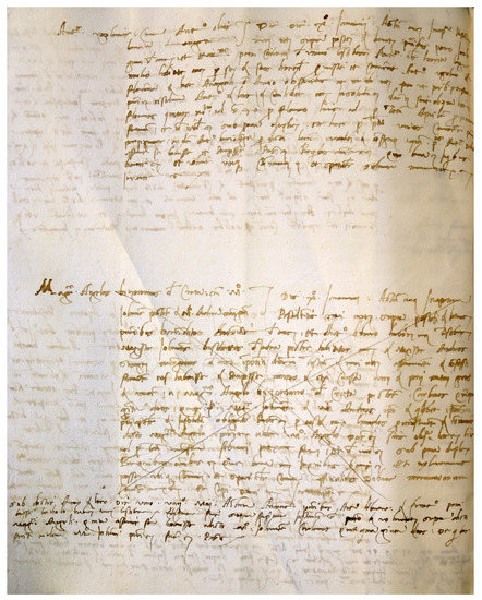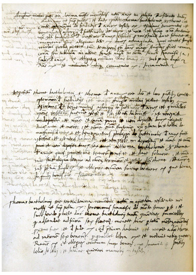 Speculations aside, the key to safely revealing the painter’s identity can be traced once again in the archival sources. More specifically, in the records of another Anconitan notary, Troilo Leoni, the name of Angelos Bitzamanos (“Angelus Bizamanus”) appears on three different acts, all stipulated in Ancona during the year 1508 (ASA, vol. 165, notary Troilo Leoni, 1508). The first document dates from 10 January 1508, when “Magister Angelus Bizamanus de Creta” gave a loan of 52 carlini to the painter Johannes Boschetus from Zadar and the carpenter Andrea di Giorgio (Appendix C, Figure 2). This document was briefly mentioned by Marcello Mastrosanti, who read the painter’s name erroneously as “Angelo Bizantino” (Mastrosanti 2011, p. 285). The second act was signed on just the following day, 11 January 1508, when Angelos Bitzamanos together with the aforementioned Johannes Boschetus—this time named as his associate (“socio”)—promised to execute certain unspecified painting works for three different patrons, one of whom was Niccolò Scottivoli (Appendix D). The last series of documents dates from 9 May 1508. On that day, both of the previous contracts were cleared, and in addition, Angelos Bitzamanos appointed painter Johannes Boschetus as his procuratore, authorizing him to represent him and demand the payment of a debt owed by Benvenuto Scottivoli and Antonia, widow of Bartolino Naffini (Appendix E). The name of Angelos Bitzamanos is also listed on the volume’s index: “Angelus Bizamanus cum Magistro Johanne pictore et socio”, “Angelus predictus cum dicto Magistro Johanne”, and “Angelus Bizamanus procuratorem in Magistrum Johannem pictorem” (ASA, vol. 165, notary Troilo Leoni, 1508).