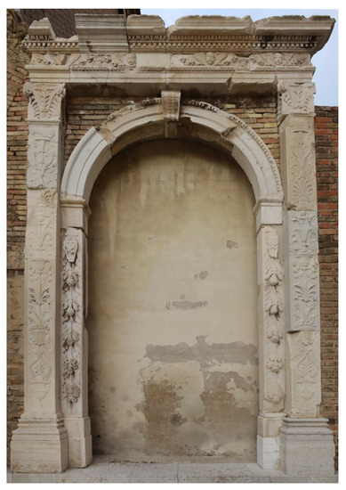“Due piccioli altari di pietra, ed un deposito a basso rilievo scolpiti sino dall’anno 1500 [...] furono in quella circostanza conservati per farne altro uso. [...] il migliore altare co’ pilastri a fiori e fogliami e contropilastro sostenente l’arco con gruppi di frutti egregiamente incisi da saggio seultore in quella stessa pietra di Brioni, ehe pochi anni prima avanzò, allorché si ornò la facciata e la porta maggiore, servì per porta principale del Convento”. [Two small stone altars, and a low relief deposit carved since the year 1500 [...] were preserved in that circumstance for a different use. The best altar with the pillars with flowers and foliage and the counter-pillar supporting the arch with groups of fruits excellently engraved by a talented sculptor in that same stone of Brioni, which a few years earlier adorned the facade and main portal serving as the main entrance to the Convent] (Buglioni 1795, p. 47; Cited in Moretti 1929, p. 75).