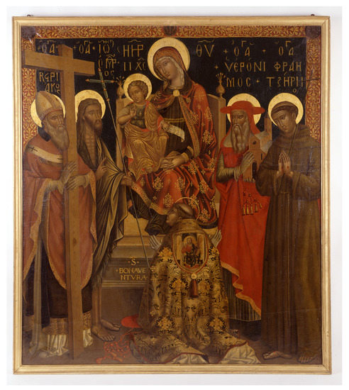 Although the icon’s provenance is not documented, in all probability it became part of the Vatican collections during the papacy of Gregory XVI (1831–46), whose cultural policy promoted the acquisition of works of Byzantine and Early Renaissance art with the intent to enrich the pontifical collections (De Rossi 1876, p. 140; D’Achiardi 1929; Costanzi 2005, p. 26). With the assistance of monsignor Gabriele Laureani, prefect of the Apostolic Library, pope Gregory addressed an encyclical letter to various religious orders throughout the papal states, calling them to give away works of the so-called “primitives” in their possession that were not in use and stored in their deposits. The paintings collected at Laureani’s initiative eventually formed the nucleus of the Museo Cristiano at the Vatican Library, where the panel in question was first displayed. Indeed, the icon was first mentioned in 1867 by Xavier Barbier de Montault, who saw it at the bookbinding atelier (“atelier de reliure”) of the Vatican Library (“La Vierge et l’Enfant Jésus: à la droite du trône, S. Jean-Baptiste et S. Macaire, évêque de Jérusalem; à gauche, S. Jérôme et S. François d’Assise; au pied, S. Bonaventure, dont le nom est écrit en latin, tous les autres étant en grec. Tableau byzantin du XVe siécle”, Barbier de Montault 1867, p. 8). De Montault identified all figures depicted on the icon save for Saint Cyriacus, whose name he misread as Macarius. During the early 20th century, the icon was kept at the deposits of the Pinacoteca Vaticana, from where it was temporarily moved to the papal private chapel in February 1923, only to be returned to the deposits later in August (Bezzini 2010, pp. 281, 289). Subsequently, in 1991 the icon briefly appeared in an article by Marisa Bianco Fiorin, who reported seeing it at the Palazzo del Governatorato and attributed it to a Greek painter of the late 16th century (Bianco Fiorin 1991, p. 212n14, fig. 3). The icon was later moved to the first loggia of the Apostolic Palace in 2003, after several relocations. The painting was last discussed by the author in 2007, when it was first associated with the cultural milieu of Ancona (Voulgaropoulou 2007, pp. 174–76, n. 68, fig. 122–23).