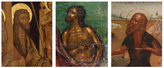 Likewise, Saint John’s facial features and slim ascetic body have been rendered in a similar manner to that of the male figures in Bitzamanos’ triptych from Walters Art Gallery, as well as to several figures from the predella of Komolac, namely saints John, and Jerome and the beggar from the panel of Saint Martin (Figure 7).