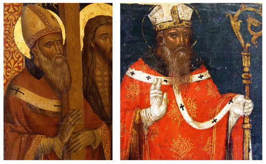 Saint Cyriacus, on the other hand, is portrayed as a bishop, resembling the figure of Saint Blaise from the said predella, although in a much more elaborate and detailed manner, which is easily explained by the larger scale of the composition (Figure 8).