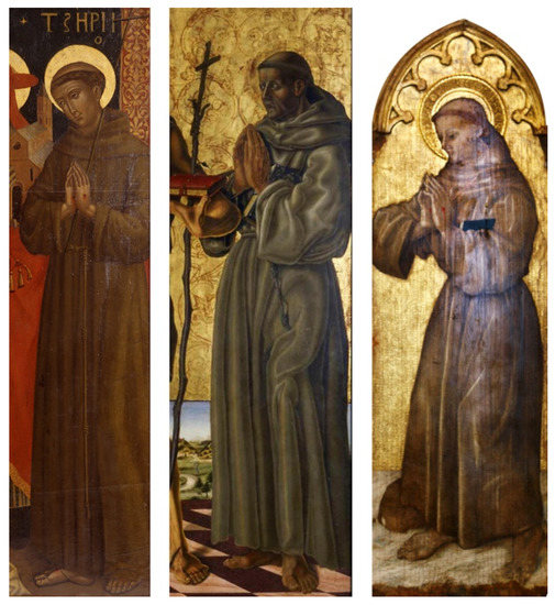 Angelos Bitzamanos. Saint Francis (detail from the Scottivoli altarpiece), 1508. Vatican, Apostolic Palace (left) © Musei Vaticani. Reproduced with permission; Nicola di Maestro Antonio d’Ancona. Saint Francis, 1472. Pittsburgh, Carnegie Museum of Art (middle) Image in the public domain; Nicola di Maestro Antonio d’Ancona. Saint Francis (detail from the polyptych of Jesi), 1487. Avignon (right) Image in the public domain; Figure created by author.