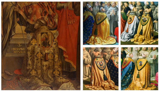 Furthermore, the depiction of Saint Cyriacus bearing the True Cross evokes the figure of Saint Andrew from Nicola’s altarpiece for Casteldemilio (Agugliano), now at the Pinacoteca Vaticana, a work contemporary to Angelos’ altarpiece as it was painted in 1504–08 (Mazzalupi 2008b, p. 295), as well as models employed by the Crivelli workshop, as for example the figures of Saint Andrew from Carlo Crivelli’s polyptychs of San Francesco a Montefiore dell’Aso, San Domenico, and Camerino. The visual dialogue between Cyriacus’ massive, realistically rendered cross and the slender staff-cross of Saint John, is yet another element frequently encountered in Italian Renaissance works, such as Carlo Crivelli’s polyptych of San Domenico in Ascoli. Saints John and Jerome were also possibly inspired by Crivelli’s works, such as the altarpiece from the Cathedral of Camerino. Crivelli’s influence extends to the ornamental elements of Angelos’ painting, notably the highly ornamented floral patterns of the robes of the Virgin and Saint Bonaventure (Figure 11).