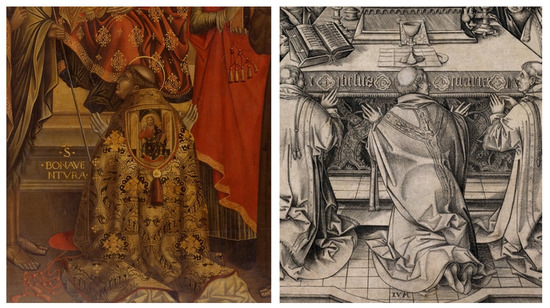 Angelos Bitzamanos. Saint Bonaventure (detail from the Scottivoli altarpiece), 1508. Vatican, Apostolic Palace (left) © Musei Vaticani. Reproduced with permission; Israhel van Meckenem, The Mass of Saint Gregory (detail), ca. 1490 (right). Image in the public domain; Figure created by author.