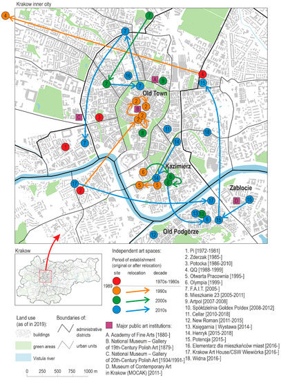 Krakow is, next to the capital city of Warsaw, the main centre of visual arts in Poland with one of the oldest academies of fine arts established in 1818 (Romańczyk 2018). Despite being regarded as fairly conservative in terms of artistic taste, both before and after the Second World War, it was the birthplace of many movements in the visual arts (Wallis 1994). In this context, I was interested where subsequent generations of independent artistic initiatives were located during the last five decades, both within the urban structure and within the built environment. It was reflected in my interest in studying how different independent endeavours were using meanings associated with various parts of the city in their artistic practices and which were evolving during the period under study (Górka 2004; Murzyn 2006; Smagacz 2008; Zwiech 2018). Additionally, their location was put in relation to the clusters of galleries emerging after 1989, when both non-profit art spaces and commercial galleries were allowed to operate without political constraints (Działek 2021). It was interesting to determine whether the main oppositions inherent in the field of art, between heterodox and autonomous vs. orthodox and heteronomous initiatives (Mangset 1998; Lizé 2010; Picaud 2017), were reflected in their spatial distancing while also taking into account the post-socialist context of the city.