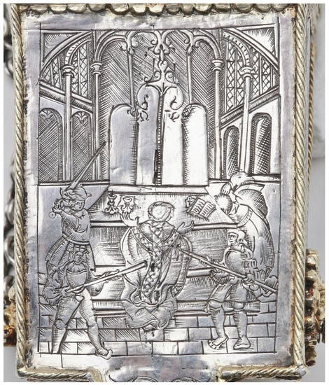 This functional yet beautiful object was created to serve a very specific purpose and the needs of its user. Getting away from the idea of patron and artist and thinking instead about the artistic and iconographic context of its creation and, just as importantly, its use, we should not see this unusual depiction of Becket’s martyrdom as simply a late-developing iconographical variant, but in terms of the ‘pictorial syntax’ of how the image was designed and received in potentially new ways (Marrow 2006, p. 174). Radical changes in the viewpoint, the framing, the depictions of the murderers and the murder weapons were not innovations for their own sake. As noted, they were part of a more affective piety drawing the user/viewer into the scene, but they also linked directly to, and nuanced the understanding of, the function of the case which bore the image. Becket was particularly associated with healing. Yet, by placing particular emphasis on the Mass setting and the blood sacrifice of his martyrdom, the image makes connections with the contents of the box: lancets, probes, and other cutting tools which would themselves spill blood. Rather than show Becket with a head wound, his death is reimagined along Christological lines with long stabbing instruments inflicting precise wounds, again linking to the lancets and ‘spaters’ also shown on the front of the case. The viewer is invited into the scene by the breaking of the boundary by one of the attackers’ feet—is the surgeon invited to think about how he might save Becket from these potentially non-fatal wounds to the back, rather than showing him with an irreparably shattered cranium? The artist sought to re-orient the image of the martyrdom in a way that would force a new engagement with its meaning on the part of the viewer. Following this cue, we have shown how the image itself sheds new light on the dynamism and regionality of Becket’s cult on the eve of the Reformation.