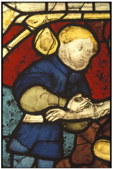 A surgeon uses a lancet. From the St William Window of c. 1425, York Minster CVMA nVII panel 18a.