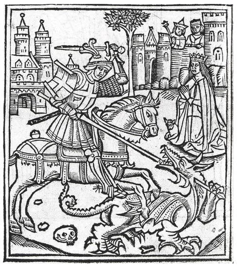 Woodcut of St George and the dragon. Alexander Barclay, Life of St George (London: Richard Pynson, 1515) frontispiece.