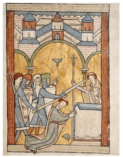The martyrdom of Thomas Becket, by an English or French artist c. 1175 × 1200, British Library, London, Harley MS 5102 fo. 32r.