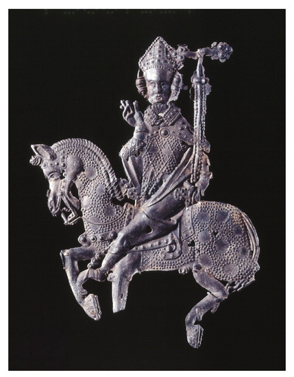 The second type of badge shows the archbishop on horseback, and these are more securely associated with the feast of the Regressio at Canterbury. These badges clearly reference images of Christ’s entry into Jerusalem which depict Christ, mounted on a donkey, one hand raised in blessing, passing through the gates of the city, greeted by cheering followers and often by children climbing trees and tossing down boughs to strew before him. These images, canonical by the fourteenth and early fifteenth centuries when these badges were popular, have their origins in the adventus processions of the Roman emperors, which artists of the fourth century adapted to contrast Christ’s humility with imperial splendor. Brian Spencer catalogues ship-shaped ampullae and ship badges that include an image of St. Thomas standing on the deck, as well as the equestrian badges all as connected to the feast day of the Regressio, and it allows that they may have caught on as badges from the Canterbury pilgrimage more generally over time (Spencer 1998, p. 79).
