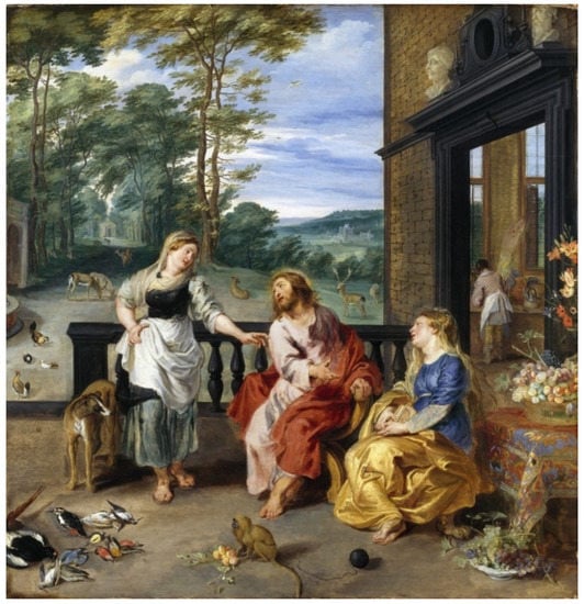Around 1628, the Flemish painters Peter Paul Rubens (1577–1640) and Jan Brueghel II (1601–1678) produced a very novel representation of this scene for the Flemish painting of the 16th and early 17th centuries (National Gallery of Ireland, Dublin), a formal composition that had very little precedent. Unlike the usual indoor spaces that characterized the traditional composition of this scene, Rubens and Brueghel II transferred this biblical episode to the outdoors. Thus, a luminous landscape in the background (Van Mulders 2016, p. 94), attributed to the hand of Jan Brueghel II (Figure 1), frames the encounter of Jesus, Martha and Mary.