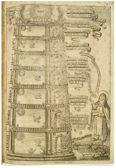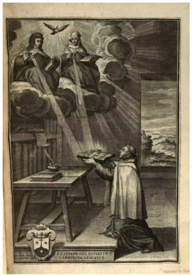 Precisely, we find another good example of using the landscape as a visionary experience representation in the work of another mystic Carmelite, the Portuguese father Joseph del Espiritu Santo. That can be seen in the engraving that preceded his mystical theology book, The Cadena Mystica Carmelitana (1678) (Figure 3. In this treatise, Joseph del Espíritu Santo explains the different types of contemplation (infused and acquired) and dedicates a good part of the book to arguing in favor of contemplation through creatures. All of these elements are depicted in the engraving with a similar symbolic framework to the one we have observed so far. The artist represented Father Joseph inside his cell experiencing a vision of Saint Teresa and Saint John of the Cross, who seemed to inspire him in the task of writing the Cadena Mystica. At the center of the composition, there is a representation of the dove of the Holy Spirit, which alludes to the devotional name of Father Joseph when he took up the habits of the order. In the background, there is an opening that framed a landscape, as a symbolic representation of acquired contemplation and the state of spiritual revelations that led the friar to the vision. The artist used a compositional model that, according to all evidence, had already proven acceptance: the inclusion of the landscape through vertical openings that produced a marked contrast between interior and exterior, darkness and light, confinement and immensity, and meditation and revelation.