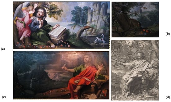 As in Juli’s canvas, the theme of nature as God’s second book was represented by some other viceregal painters in various compositions. Among them was the famous Cochabamba painter Melchor Pérez de Holguín (ca. 1665–ca. 1730), a renowned painter of ascetic and mystical subjects. In the series of the four evangelists executed in 1714 and preserved in the Museo Nacional de Arte of La Paz (Figure 6a–c), Holguín displayed a kind of moral theater and a series of battles between good and evil fought by different animals. If we compare the painting of Saint John Evangelist with the model used by Holguín, an engraving by François de Poilly (1623–1693) after a painting by Charles Le Brun (1619–1690)26 (Figure 6d), we realize the interest of the Cochabamba painter in the representation of the landscape, which is much more developed and detailed than the appearance in the de Polly’s engraving. Likewise, Holguín, conceives the landscape as a frame where the mysteries of God revealed through the behavior of nature. These animalistic scenes replaced the conventional iconographic motifs that generally appeared in other series of the four evangelists, which used different episodes taken from the gospels represented at the bottom of the composition27. In this way, the painter visualized the two channels through which the Word manifested itself, that is, the two books: the gospels and the book of nature.