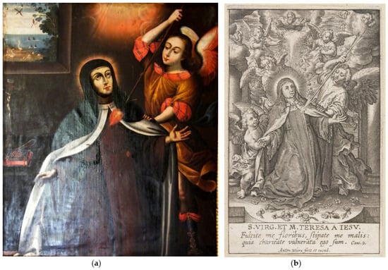 (a) Unidentified artist, Transverberation of Saint Teresa, 18th century, oil on canvas, Monasterio de Santa Teresa, Arequipa, Perú. Credit line: Sebastian Ferrero. (b) Anton Wierix, The Transverberation of St. Teresa, engraving. Credit line: The Metropolitan Museum, New York.