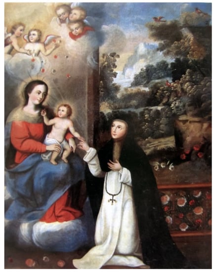 The penances and spiritual exercises of Saint Rose constantly led her from the earthly world to the spiritual world. One of her biographers, the German Dominican Leonardo Hansen, described how she, during the embroidery exercise, would enter in and out of ecstasy in each of the stitches she made. According to Hansen, when Rosa was sewing and when she raised her needle and thread high, it seemed that she lifted her spirit in divine ecstasy; and being briefly suspended in space, with her hand still raised, she would return at the same moment to the work, with such successful skill and with such dexterity, that the needle would be turned to the exact place so that the work would be finished (Mujica Pinilla 2005, pp. 235–37).