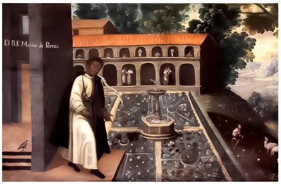Just as the human body imprisoned the soul, the cell walls contained an immeasurable nature that was accessible through meditation, prayer, or penance. The pictorial representation of this metaphysical phenomenon, in which the body of the practitioner is transferred from one space to another—from the convent to immeasurable countryside—is evident in compositions of great originality. In this regard, we note a canvas conserved in the monastery of Santa Catalina of Cuzco, a 17th-century painting according to Pedro Gjurinovic Canevaro (2012, pp. 142–43), which represents one of the best-known miracles of the Peruvian saint, San Martín de Porres (1579–1639): to make a dog, a cat, and a mouse eat from the same plate in complete harmony (Figure 11). The scene seems to be set in the garden of the conventual cloister of Santo Domingo de Lima, where San Martin entered in 1594 as a lay brother. In the foreground, Martin commands these animals to eat together from the same plate without quarreling, while a few Dominican brothers observe the miracle from the opposite arcades. The most interesting thing about this canvas is how the painter represents the seclusion and monastic retreat as a mental and spiritual journey that places the soul outside the conventual limits. Thus, we can see how one of the walls of the convent is artificially dissolved, allowing us to perceive a landscape that certainly has nothing to do with Lima’s views, but rather presents as an image of a metaphysical and idealized world in Flemish landscape style. The place is inhabited by a shepherd and his sheep, which could be an allusion to the divine shepherd, the Beloved of the Song of Songs, remembering the final stage of the Unitive path.