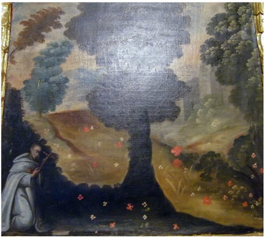 However, the most interesting canvas for this study has lost its legend, preventing us from properly identifying it. It would be another venerable Mercedarian father who, quite possibly, would have professed in Peru. This friar appears at the extreme left of the composition wearing the habit of the order. His gesture seems to indicate that he has fallen into a deep trance while he contemplates the crucifix (Figure 12). Despite finding similarities with the theme of the holy hermits, due to their representation in total immersion in nature, these paintings from the Mercedarian convent represented friars who served in viceregal convents in urban spaces. Therefore, the landscape here must be interpreted as the representation of the friar’s mental transfers from the conventual cell to the imagined countryside. The confinement’s transformation into immense spiritual freedom is assumed by an idyllic landscape painting.