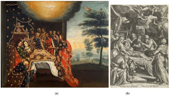 In another vein, a canvas preserved in the Museo de Arte de Lima (MALI) depicting the Dormancy of the Virgin, which was executed in the 18th century (Figure 13a), shows a very peculiar use of the landscape in colonial Andean painting. Here, the landscape played a much more complex narrative role, which even tackled a theological issue regarding the true nature of the assumption of the Virgin, either in soul or, on the contrary, in body and soul (Stoichita 1996, pp. 40–44). The composition follows a 1567 Cornelis Cort (ca. 1533–1578) engraving after a design by Federico Zuccaro (1542–1609) (PESSCA, 3865A)35 (Figure 12b), which was later transformed by the colonial painter. He eliminated the angels that, according to some apocryphal texts, such as Dormitionem BV Mariae of John of Damascene, veil the Virgin Mary on her deathbed and, three days later, accompany the transit of her body to Glory (González 2017). He added the presence of the dove of the Holy Spirit, which is absent in the original engraving. Finally, he integrated an exquisite twilight sky landscape on the right side of the canvas, taking up almost half of the composition. Luis Eduardo Wuffarden is right in pointing out the dislocated and unreal aspect of the scene that the insertion of the landscape gives, as it is also correct, in our opinion, to link the landscape with the assumed character of this episode (Wuffarden 2016, p. 116). According to John of Damascene, it was Jesus himself who descended to receive Mary’s soul and led her to the celestial throne, and not the Holy Spirit. Consequently, the presence of the dove on the MALI canvas could have different interpretations: marking the beginning and the end through the conception and death of Mary, alluding to the role played by the Holy Spirit in warning the apostles of the death of the Virgin and then transporting them on clouds to the place where the Holy Mother lay; or, it could highlight the descent of the Holy Spirit to rescue the body of Mary and to take it to heaven and complete the anticipated resurrection of the Virgin in soul and body.