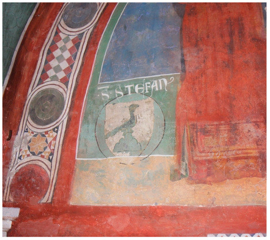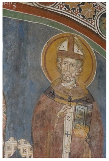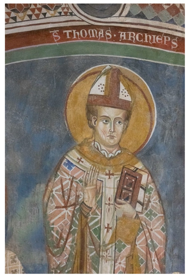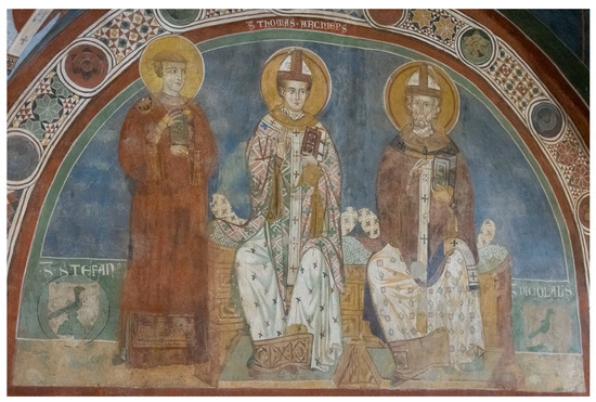The painting with Thomas Becket (Figure 1) decorates the top lunette on the western wall of the middle bay of the lower liturgical hall (Figure 9). On a blue background, it depicts a long throne carved with two steps on which sit Thomas Becket and St. Nicholas of Myra to his left; to the right of the English martyr stands the figure of St. Stephen. All three characters are blessing with their right hand while in their left they hold a book. Thomas and Nicholas are dressed in bishop’s robes, with a mitre, pallium and cope, while Stephen wears his customary dalmatic. The figures are identified by tituli, but while that of Thomas archiepiscopus is located at the top, on the red frame of the archivolt, Sanctus Nicolaus and Sanctus Stefanus are written in different characters by the sides of the two saints and both are surmounted by the same coat of arms: a bird above a mountain with five peaks.