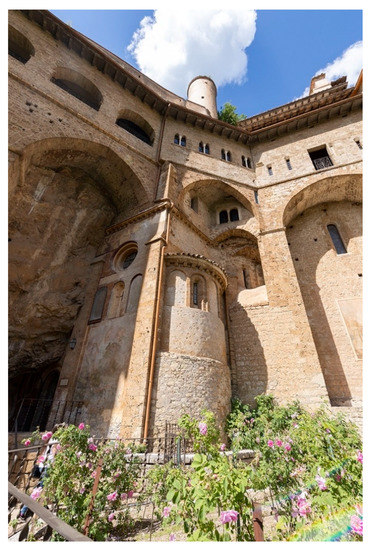 At the beginning of the sixth century, St. Benedict of Norcia, fleeing Rome and worldly temptations, sought refuge in Subiaco in the Aniene valley, as Gregory the Great recounts in the second book of his Dialogues.1 Benedict’s presence encouraged the development of cenobitic life in the valley with a series of no less than thirteen monasteries founded directly by the saint (Pani Ermini 1981; Fiore Cavaliere 1994, pp. 13–24). Among these, already at the end of the tenth century, the monastery of Santa Scolastica stood out for its importance and became the centre of a vast territory (Cerone 2015, pp. 39–43). From the end of the twelfth century, however, it was the community established at the Sacro Speco that took up Benedict of Norcia’s spiritual inheritance, thanks in part to the inspiring presence of Benedict’s cave, which was a constant reminder of the sacrifices required by regular life.