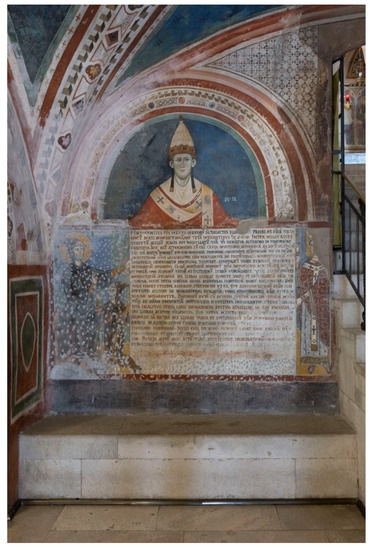 To mark the completion of the renovation of the devotional route, as well as to seal these papal initiatives, the north wall of the future lower church was frescoed with the text of the decretal issued by Innocent in 1203, sanctioning the donation of a portion of the income of the castle called Castrum Porciani (near Ferentino) to the monks (Figure 4). This wall marked the point at which the Holy Stairs ended and the descent towards Benedict’s cave began, and was thus an important place, clearly visible to all, in which to post the manifesto of the papal policy that exalted the monastic community and, at the same time, celebrated the authority of the Pope. The fresco, as well as accurately reproducing the Bull, depicts the figure of the pontiff as a donor intent on holding the document together with St. Benedict, at whose feet kneels the Abbot Romanus (De Prosperis 2008, pp. 21–24; Israel 2004). The latter, obviously, symbolizes the entire community of Subiaco, but it is important to remember that the donation letter was addressed not to the abbot, but to the prior of the Speco, Iohannes, a character to whom we will return precisely in relation to the lunette with Thomas Becket.5