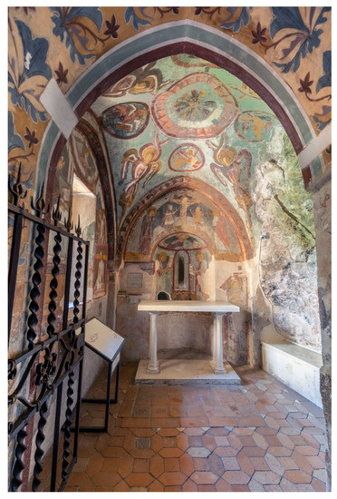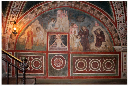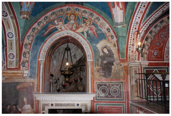 It is impossible to establish the exact date of the whole enterprise: given its imposing nature, construction must have taken several decades. Certainly, the external analysis of the walls, the architectural characteristics and the information provided by the chronicles suggest the hand of the two great abbots: Landus (1227–1243) and Enricus (1245–1273), also protagonists of the restructuring of Santa Scolastica (Cerone 2015, pp. 73–79). Moreover, the terminus ante quem for this construction phase is represented by the Stories of Benedict frescoed on the walls of the hall and in the cave between the end of the century and the very beginning of the next.8 This cycle was executed by a highly diverse workshop led by Magister Conxolus, who signs his name on the north wall beneath the Virgin and Child, and consists of a careful selection of scenes from the life of the saint, relating exclusively to his time at Subiaco and aimed at highlighting the presence of the cave, depicted in almost all of the episodes (Figure 8).