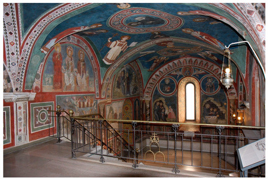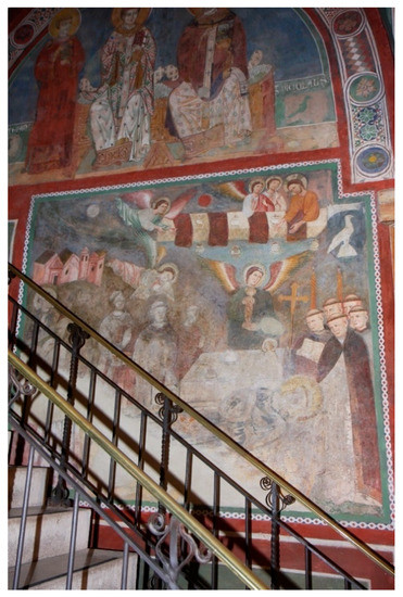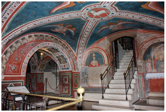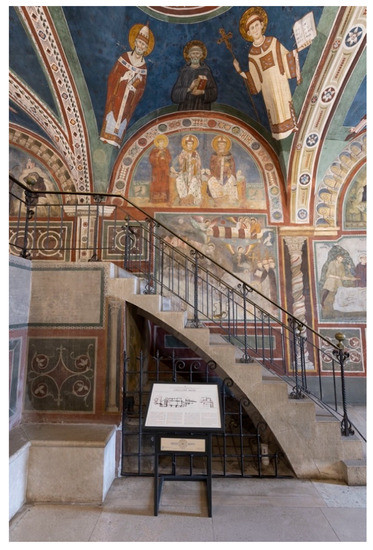 The creation of this new liturgical space entailed the rationalization of the route followed by the faithful, fragmented between the chapel of the Virgin with the overlying chapel of St. Gregory, the room containing the Holy Stairs, and the landing hosting the fresco with the Bull of Innocent III (Figure 7). The creation of this large space, divided into three bays with a cross vault, made it possible to redesign the staircase in a more monumental form. The latter was also provided with a new roof; the entrance to the chapel of St. Gregory was rearranged and the residential block for the monks was built, grafted onto the sanctuary from the west.7