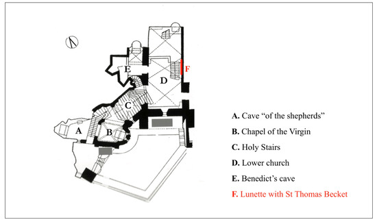 The papacy of Pope Innocent III (1198–1216) marks the start of a long phase in which new buildings were constructed next to the caves in a gradual process of monumentalization that lasted until the end of the thirteenth century. The worksite was divided into two distinct phases: the first at the beginning of the century, ending at the time of Gregory IX (1227–1241); the second—more significant—in the second half of the thirteenth century, sealed by the fresco painting of the lower church with the Stories of Benedict by Magister Conxolus, executed at the end of the thirteenth or perhaps the very beginning of the fourteenth century (Giovannoni 1904, pp. 381–88; Righetti Tosti-Croce 1982, pp. 78–86). To correctly contextualize the lunette with St. Thomas Becket both phases should be examined because this was one of the first paintings to decorate the sanctuary, but in the second half of the century it was also significantly restored and even incorporated into the new decorative programme.