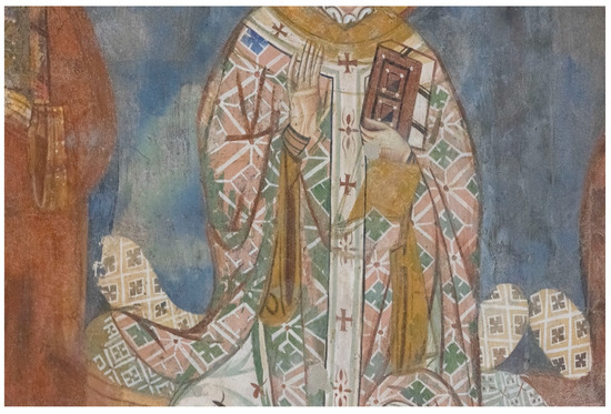The fresco presents some formal and compositional inconsistencies: the faces have been repainted, in particular, that of Stephen (Figure 10), and there are evident changes to the shape of the halos and, in the case of the two bishops, the mitres, the collar and the position of the hand and book, repainted higher up (Figure 11 and Figure 12); the figure of Stephen and, to a lesser extent, that of Nicholas, protrude from the blue background and invade the later “Cosmatesque” frame to which they are connected through a white line that also surrounds the coloured areas of the background. The coats of arms were added when the fresco was dry and have now lost their original colour and part of the black outline, but they may be contemporary with the original painting.10