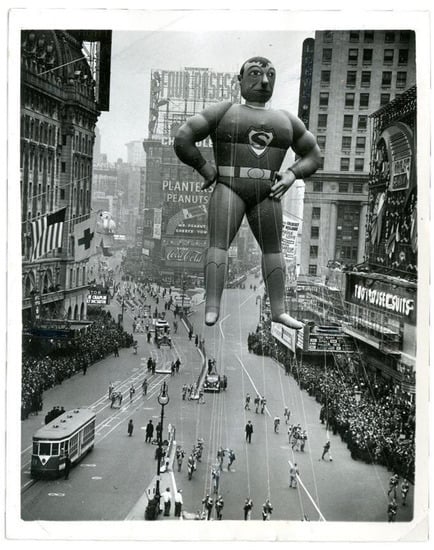 Tony Sarg (designer), Superman Balloon in the Macy’s Thanksgiving Parade, 1940, 2286 × 1341 cm. Photo: Wiki Fandom, Creative Commons.
