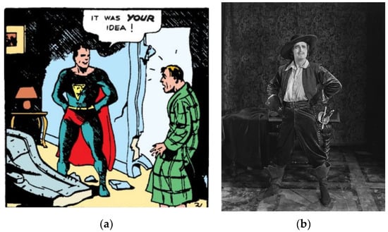 (a) Joe Shuster, Superman in a Fairbanks Stance (panel No. 21), 1938. Siegel and Shuster (June 1938), “Superman,” Action Comics #1 (Siegel and Shuster 1938a, p. 10). © DC Comics; (b) Douglas Fairbanks, The Iron Mask, 1929. Photo: Wikipedia Commons, Public Domain.