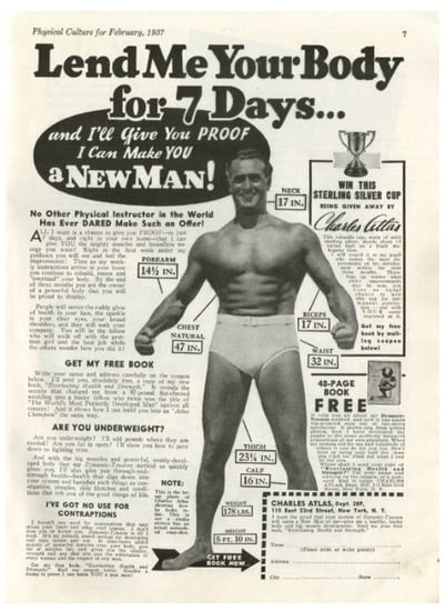 Charles Atlas, “Lend Me Your Body for 7 Days,” Physical Culture vol. 77 (2), 1937, p. 10. https://dmr.bsu.edu/digital/collection/PhyCul/id/13386 (accessed on 27 August 2021). Source: Ball State University Archives and Special Collections.