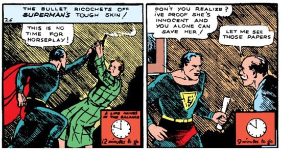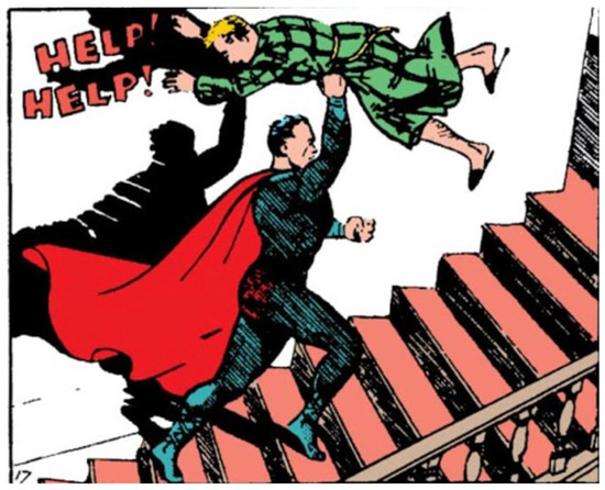 The frightened villains, Superman’s heroic scenes, the humor and often times comically exaggerated gestures, and the damsel in distress are all perpetual visual motifs in the first issues of the Superman comics. The closing panel on the second page of the first issue portrays Superman holding a man above his head because he was interfering with his mission to wake up the governor to save a woman that was wrongly convicted and was to have been executed in a few hours. To get to the governor, Superman carries the man who tries to stop him, while the latter, portrayed horizontally above Superman’s head, cries for help (the words ‘Help! Help!’ are hovering above their heads). It is a humorous panel, which shows Superman’s strength while trying to avoid portraying a more serious scene (Figure 9). When Superman arrives at the governor’s door, the man he had lifted a few panels earlier laughs at him while explaining that the door is locked and made of steel. Superman, undeterred, crumples the steel door, and when the other man is shocked (indicated by his open mouth and the little lines around his face), Superman standing in his Fairbanks pose tells him: “it was your idea” in a humorous, nonchalant way (Figure 5). When Superman finally gets to the governor, we see a small clock in a couple of the upper panels on the fourth page, indicating the short time left before the execution (Figure 10). This could be regarded as another ‘trick’ to represent the action and the time passing by in the narrative from a visual perspective (Eisner 1985, pp. 25–37; McCloud 1994, pp. 94–117). Baetens, as noted above, refers to the linear role of the text and the more spatial aspect of the illustrations. Thus, the clock bridges the two and renders the illustrations themselves more linear to fit the storyline and to guide the reader through the illustrated narrative (Baetens 2020, p. 195).