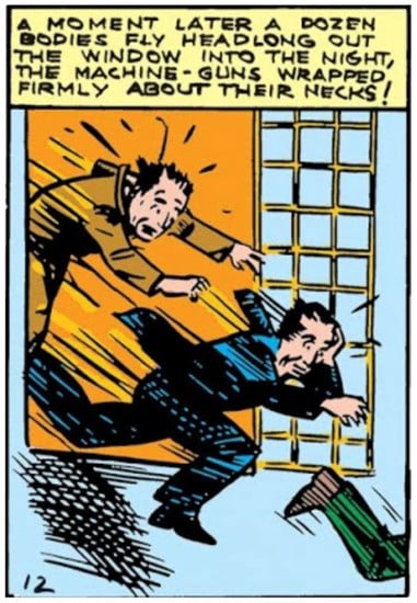 Joe Shuster, Three Armed Guards Running Away from Superman (panel No. 12), 1938. Siegel and Shuster (July 1938), “Superman”, Action Comics #2 (Siegel and Shuster 1938b, p. 23). © DC Comics.