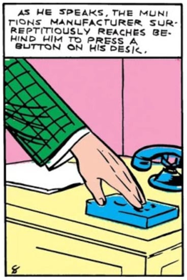 Joe Shuster, Close-Up of the Munitions Manufacturer Pressing a Button (panel No. 8), 1938. Siegel and Shuster (July 1938), “Superman”, Action Comics #2 (Siegel and Shuster 1938b, p. 23). © DC Comics.