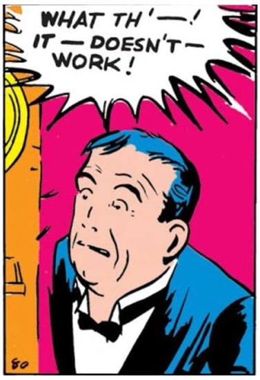 Frightened villains are also seen in various panels, for example, the two villains (and a leg of a third) in the last row of the second page of the second issue (Figure 11). There, the two main figures, with a look of fright and a few lines around their heads to indicate their shock, are running from Superman after they failed to kill him, their bullets having bounced off his chest. Close-up scenes are also plentiful in those issues—showcasing a hand about to press a button (Figure 12), a hand knocking on a door (Figure 13), and a villain shocked face when he realizes that his plan failed (Figure 14)—often indicating a moment of suspense before the action. There are many more scenes in these early issues that combine comedic elements, emotions (mainly fear), and action.
